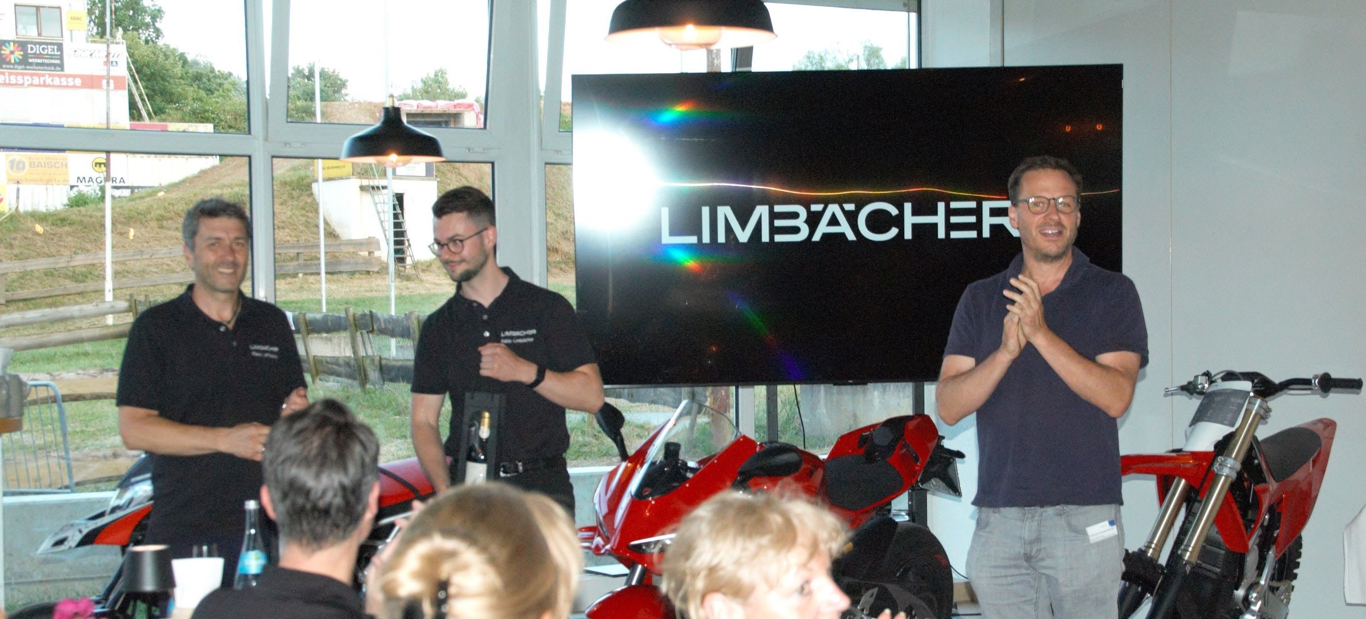 Auf das angemessene Tempo kommt es an. Das machten die vier jungen Talente deutlich, die Florian Allramseder, Vorsitzender des 1.RMC, zu Beginn des Abends für ein paar Demonstrationsrunden auf die Strecke schickte: Wer nicht beherzt am Gasgriff dreht, kommt nicht über den Buckel und zeigt keine großen Sprünge. Wer das Augenmaß verliert, riskiert eine Bruchlandung. Marketing-Club-Präsident Christoph Koppensteiner bedankte sich nicht nur für die Gastfreundschaft im Clubhaus an der Lohmühle und die Vorführung, sondern auch für den "hohen gesellschaftlichen Wert, wenn junge Menschen ihre Leidenschaft entdecken und entwickeln können." Hier konnte wiederum Klaus Limbächer einhaken, der von den Anfängen des Zweiradgeschäfts mit seinem Bruder Fritz auf dem elterlichen Grundstück in Echterdingen Anfang der 90er-Jahre erzählte. "Fast 20 Jahre hat es gedauert, bis wir die Substanz der Firma aufgebaut haben", fasste Limbächer senior die Schritte über die Umsiedlung in eine Filderstädter Industriebrache, die Verträge mit immer weiteren Herstellern und die Übernahme mehrerer Betriebe zusammen. Mittlerweile vertritt Limbächer & Limbächer 14 Kraftradmarken und betreibt zwei Häuser mit E-Bikes, was der Unternehmensgruppe in einem ansonsten recht kleinteiligen heimischen Markt eine herausragende Stellung verleihe.