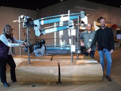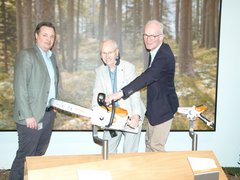Die Stihl Markenwelt will ein so genannter dritter Ort sein, wie Blum in seiner Einführung erklärte: Ein Ort außerhalb von Arbeit und Zuhause, an dem Menschen gerne zusammenkommen, am besten regelmäßig: "Uns ist es lieber, Besucher zweimal im Jahr zu begrüßen, als nur alle zwei Jahre", verwies Blum auf ein vielfältiges Veranstaltungsangebot, das vom Kurs zum Kettenschärfen bis hin zu Konzerten reiche. Dabei definierte er drei Zielgruppen der Markenwelt: Fachhändler oder auch Mitarbeiter ohne eigenen Wald und Garten bekommen im Neubau an der Rems Gelegenheit, die Kettensägen in die Hand zu nehmen und in die Unternehmensgeschichte einzutauchen. Profis aus der Forstwirtschaft oder dem Garten- und Landschaftsbau bringen sich auf den neuesten Stand der Technik. Besonders die "Sonntagsbesucher", laut Blum Familien, Schulklassen und Endkunden, sprechen die interaktiven Elemente und multimediale Installationen zum Forst als Natur- und Wirtschaftsraum an. Dass man auf Teilen der Fläche Stihl nicht vor lauter Bäumen sieht, ist Teil des didaktischen Konzepts. "Wenn wir als Stihl den Wald erklären, funktioniert das nicht", sagte Blum. Darum habe Stihl wissenschaftliche Expertise von der Universität Freiburg hinzugezogen, wo es um Themen wie Mikroklima und Borkenkäfer geht. Zu den Prunkstücken der Technik-Sammlung zählte zweifellos die 46 Kilogramm schwere Zweimann-Säge, die erstmals motorisiertes Arbeiten im Wald ermöglichte – gemäß der Vorgabe von Firmengründer Andreas Stihl, Menschen durch Innovationen die Arbeit zu erleichtern. Allerdings lieferte die fast 100-jährige Firmengeschichte auch einige Exponate abseits der einschlägigen Wald- und Wiesenthemen wie Waschmaschinen-Antriebe oder ein Go-Kart, das mit optimiertem Stihl-Motor zwei Deutsche Meisterschaften einfuhr.