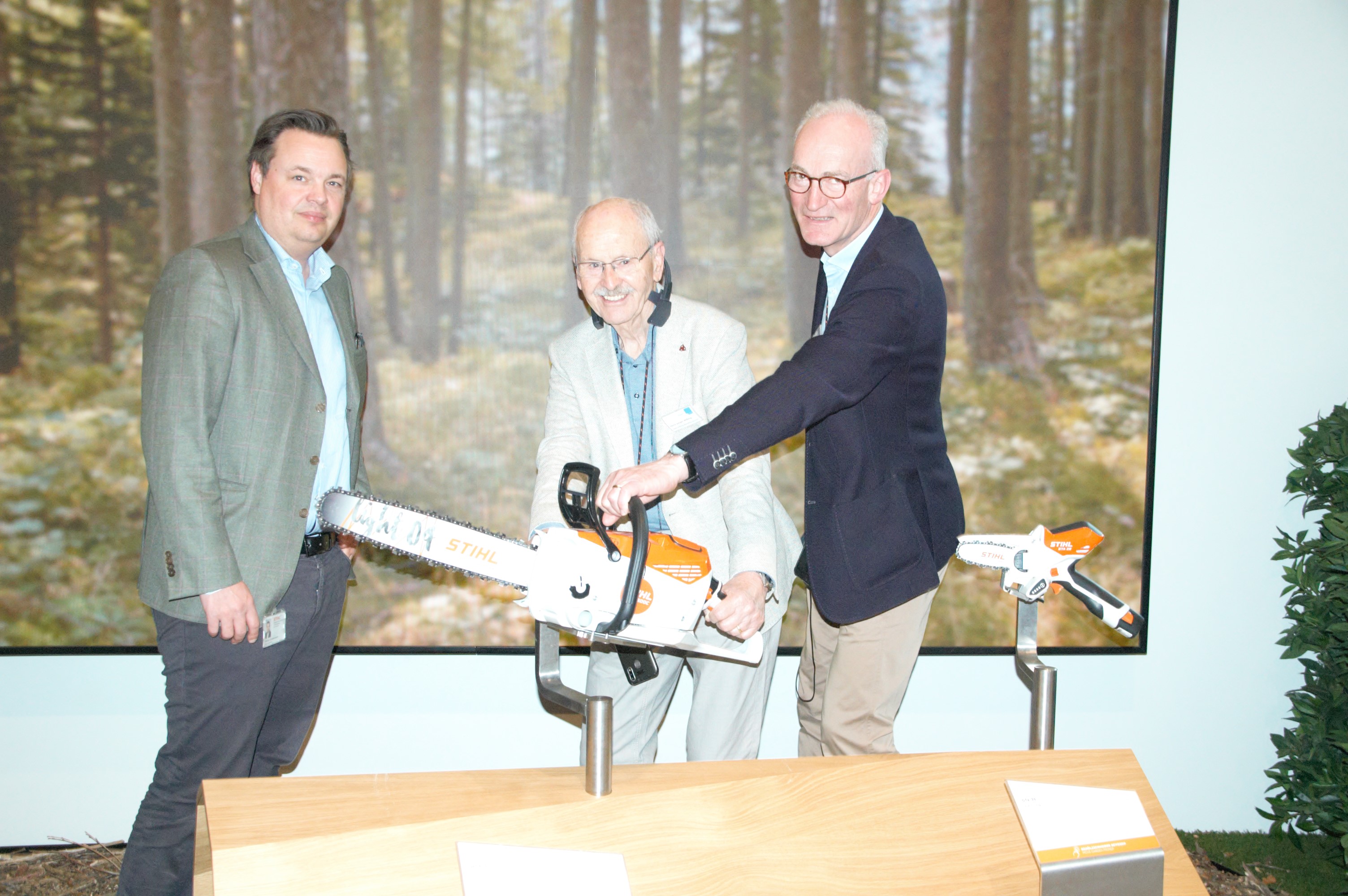 Michael Schattenmann, Leiter der Unternehmenskommunikation und selbst seit rund einem Jahr bei Stihl, räumte angesichts der Produktvielfalt ein, erst vor Kurzem gelernt zu haben, dass man sogar für "exzellente Hochdruckreiniger" die B14 nicht weiter nach Norden fahren müsse. Stihls Kundenkreis beschrieb er als professionelle Anwender – "oder zumindest solche, die sich dafür ausstatten möchten", wie er verschmitzt anmerkte. Der Vertrieb erfolge über rund 52.000 Fachhändler in 160 Ländern. Viele der Importeure seien Familienbetriebe wie Stihl selbst. Trotz des seit längerer Zeit externen Managements betonte Schattenmann mehrfach den Begriff des Familienunternehmens. Dass der über 90-jährige Hans Peter Stihl, der die Internationalisierung der Marke maßgeblich vorangetrieben habe, immer noch täglich im Unternehmen präsent sei, nannte Schattenmann "erbaulich". Tradition sei indes nicht alles, gab Schattenmann zu bedenken: "Technologieführerschaft muss immer wieder neu erarbeitet werden." Die Frage nach Verbrennungsmotoren oder Akku-Antrieb beantwortete Schattenmann global uneinheitlich, in Deutschland gehe der Trend aber eindeutig zur Batterie, was sich während der Pandemie verstärkt habe: "Man durfte nicht fliegen, aber man durfte in den Garten", erklärte Schattenmann ein Absatz-Phänomen in den vergangenen Jahren, das nun abflache, "weil unsere Produkte leider länger als zwei Jahre halten." Und als Übung zur Demut empfahl er scherzhaft, sich unter die Timbersports-Athleten zu mischen, deren Wettkämpfe im Sägen, Hacken und Balancieren Stihl seit den 80er-Jahren unterstützt: "Da fühlt man sich schmächtig und klein."